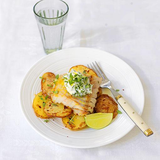 Fisk och chips med timjanmajo