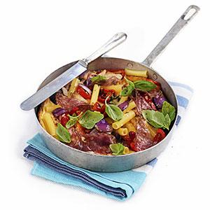 Köksomelett med pasta och salami