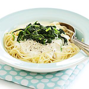 Pasta med ostsås och spenat