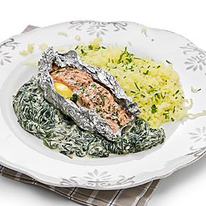 Folieångad lax med vitlöksspenat