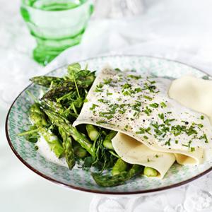 Sparrislasagne med gräslöksskum
