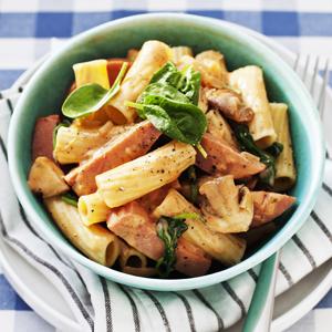 Korv stroganoff-pasta med babyspenat