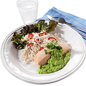 Kokt lax med ärtsås och chiliris